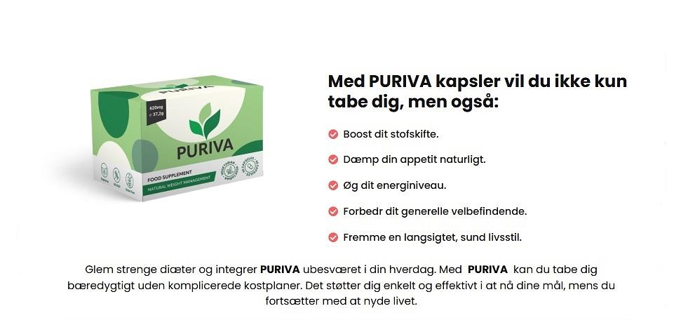 Puriva præsenteres som et kosttilskud, der har til formål at fremme vægtkontrol. De er udviklet med en kombination af naturlige og planteafledte ingredienser, der har til formål at understøtte stofskifte, energiniveauer og appetitregulering. Ligesom de fleste kosttilskud er de ikke beregnet til at erstatte sund kost eller fysisk aktivitet, men til at supplere et omfattende wellnessregime.