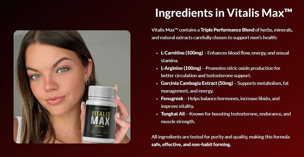 In the contemporary world, numerous men encounter difficulties pertaining to vitality, endurance, and sexual function due to factors such as stress, aging, and lifestyle choices. Vitalis Max is a potent male enhancement supplement crafted to assist men in reclaiming their vigor, self-assurance, and performance naturally. Composed of a combination of botanical extracts and vital nutrients, Vitalis Max Capsules UK seeks to elevate testosterone levels, enhance blood circulation, and boost libido without resorting to harmful chemicals or synthetic medications. Whether you are grappling with low energy, diminished sexual drive, or performance concerns, Vitalis Max presents a safe, natural remedy to help restore your competitive edge. With regular consumption, it may bolster stamina, promote firmer and prolonged erections, and enhance overall physical and mental capabilities. If you are in search of a means to feel youthful, invigorated, and self-assured once again, VitalisMax Male Enhancement might be the supplement you have been seeking.